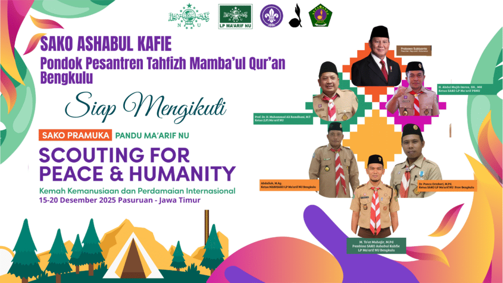 BENGKULU, 29 November 2025 — Kabar membanggakan datang dari Pondok Pesantren Tahfizh Mamba’ul Qur’an (PPMQ) Bengkulu. PPMQ secara resmi ditunjuk sebagai Duta Provinsi Bengkulu untuk mengikuti ajang bergengsi Kemah Kemanusiaan dan Perdamaian Internasional (Scouting for Peace & Humanity) yang diselenggarakan oleh Satuan Komunitas (SAKO) Pramuka Lembaga Pendidikan (LP) Ma’arif PBNU.